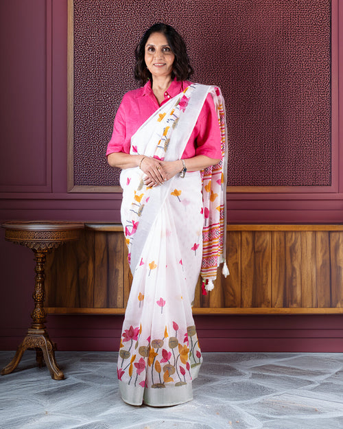 Chandani Pankhuri is inspired by the gentle beauty of blooming lotuses under soft moonlight. Set against a pristine white base, delicate lotus motifs in shades of pink and warm mustard are thoughtfully scattered across the body, creating a light and refreshing visual rhythm.